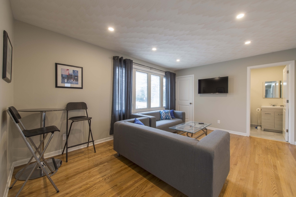 - Common spaces include large kitchen with quartz counters, breakfast bar and bar stools, fully furnished living room with wall mounted TV and separate bar table with 2 chairs.